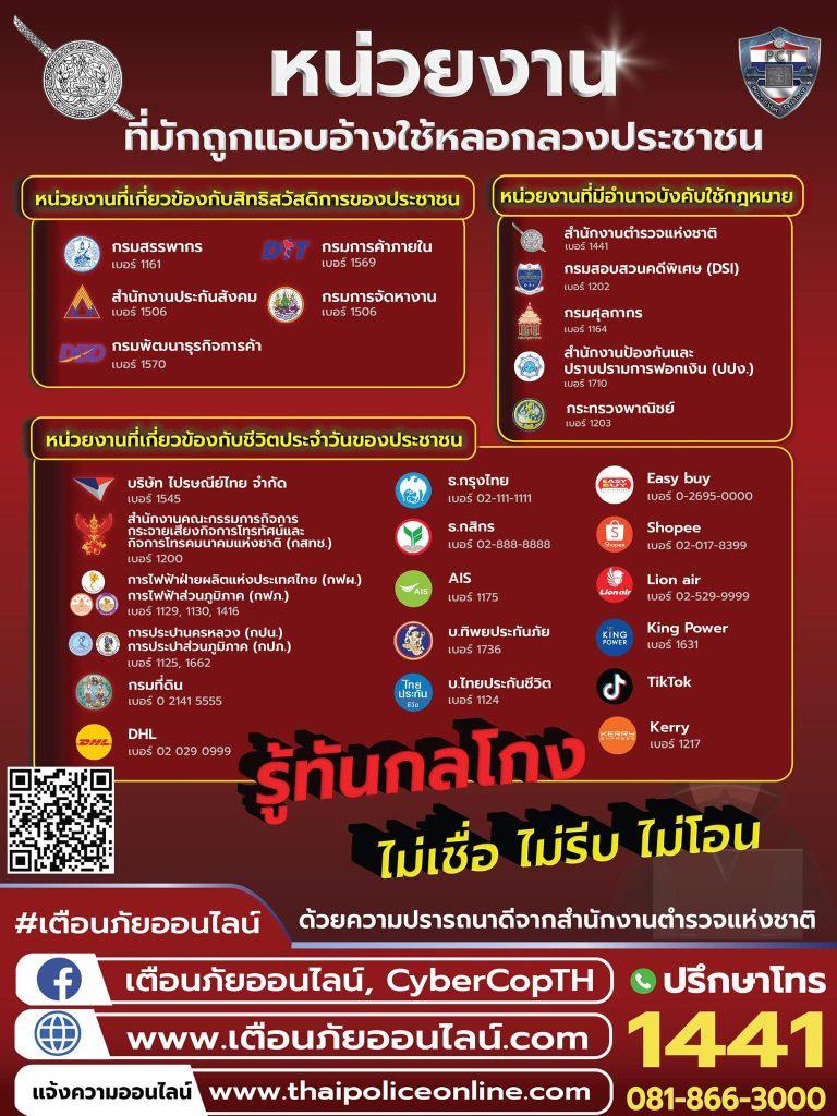 ซฟเก็บไว้เลย รวมเบอร์หน่วยงาน ที่มักถูกแอบอ้าง 👉เมื่อได้รับข้อความแปลกๆ ให้โทรไปสอบถามก่อน ❌ไม่เชื่อ ❌ไม่รีบ ❌ไม่โอน 15 กันยายน 2022 โดย Administrator-Faisan / ข่าวประชาสัมพันธ์,ข่าวฝากประชาสัมพันธ์