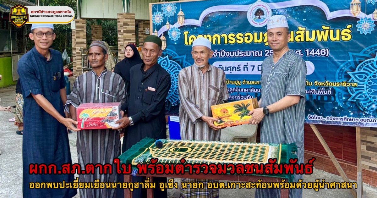 พ.ต.อ.อัสรี ต่วนเพ็ง ผกก.สภ.ตากใบ พร้อมด้วยชุดมวลชนสัมพันธ์ สภ.ตากใบ ออกพบปะเยี่ยมเยือนนายกูฮาลิ่ม อูเซ็ง นายก อบต.เกาะสะท้อน 7 มีนาคม 2025 โดย Administrator-Faisan / ข่าวประชาสัมพันธ์,ข่าวกิจกรรม,รายงายผลการปฏิบัติ,งานป้องกันปราบปราม,งาน ป. (มี.ค.) วันที่ 7 มีนาคม พ.ศ.2568เวลา 18.20 น. • พ.ต.อ.อัสรี ต่วนเพ็งผกก.สภ.ตากใบ• พ.ต.ต.ปรีดี เจ๊ะมะยูโซ๊ะสว.(ชส.)สภ.ตากใบ• ร.ท.นฐกร มุสิกะจินดา ผบ.ร้อย.ปล.ที่ 2 ฉก.นย.ทร.33พร้อมด้วยชุดมวลชนสัมพันธ์ สภ.ตากใบ ออกพบปะเยี่ยมเยือนนายกูฮาลิ่ม อูเซ็ง นายก อบต.เกาะสะท้อนพร้อมด้วยผู้นำศาสนา ร่วมรับประทานอาหารและมอบอินทผลัมณ มัสยิดอามารี หมู่ที่1 บ้านปูยู ตำบลเกาะสะท้อน อำเภอตากใบ จังหวัดนราธิวาส