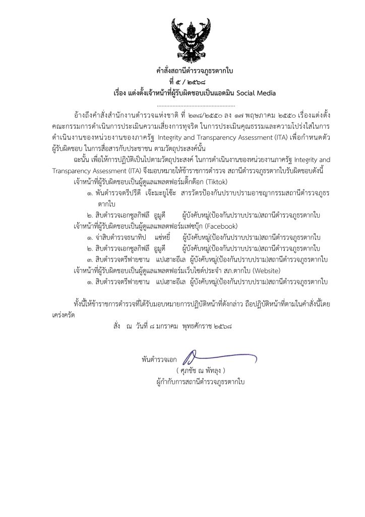 คำสั่งมอบหมายปฏิบัติหน้าที่ดูแลสื่อประจำ สภ.ตากใบ