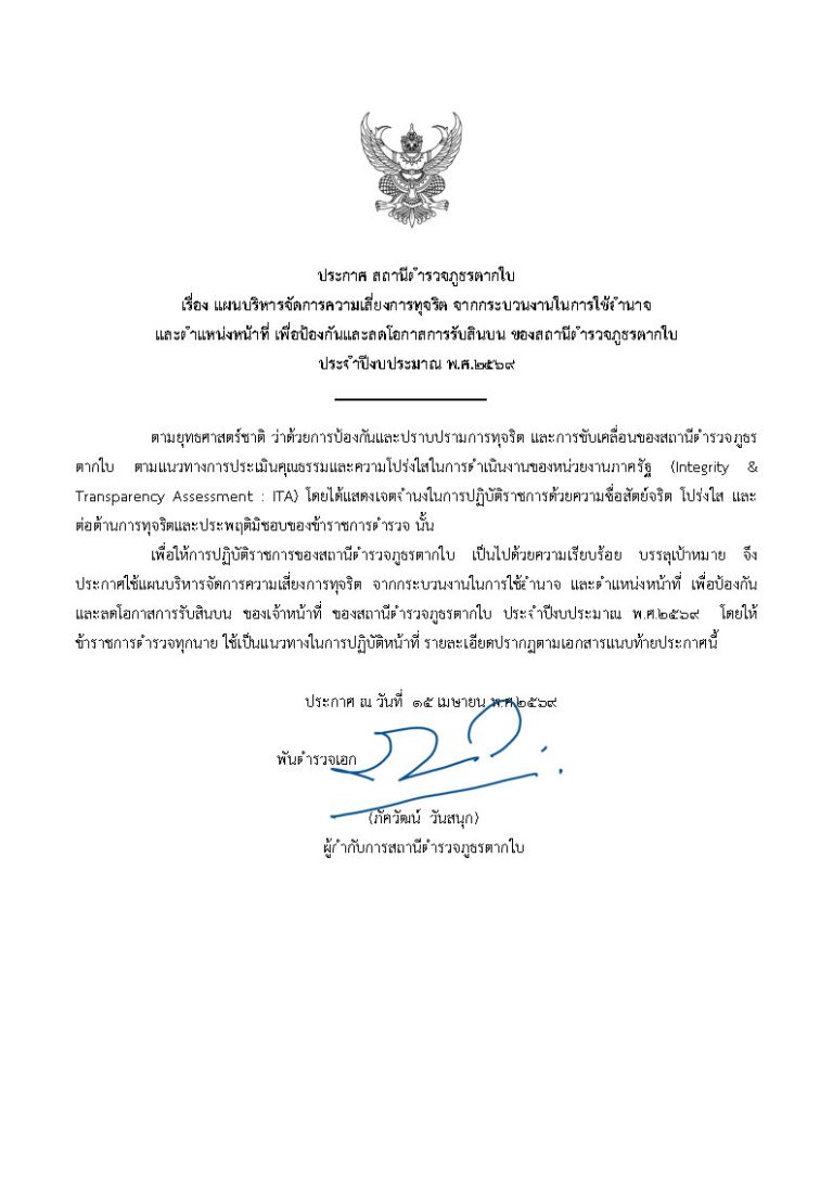 ประกาศเรื่องแผนบริหารจัดการความเสี่ยงการทุจริต สภ.ตากใบ