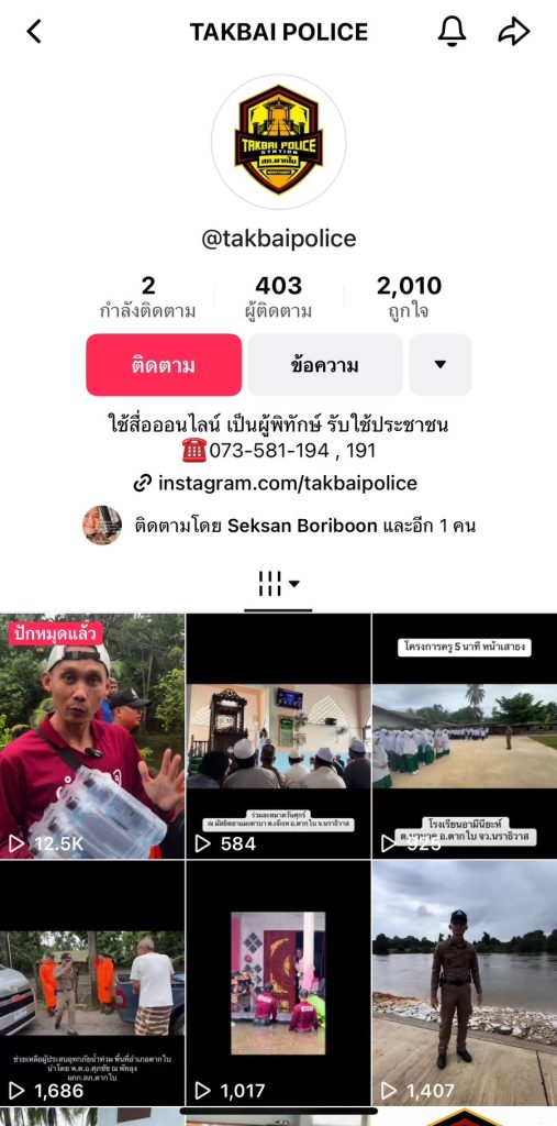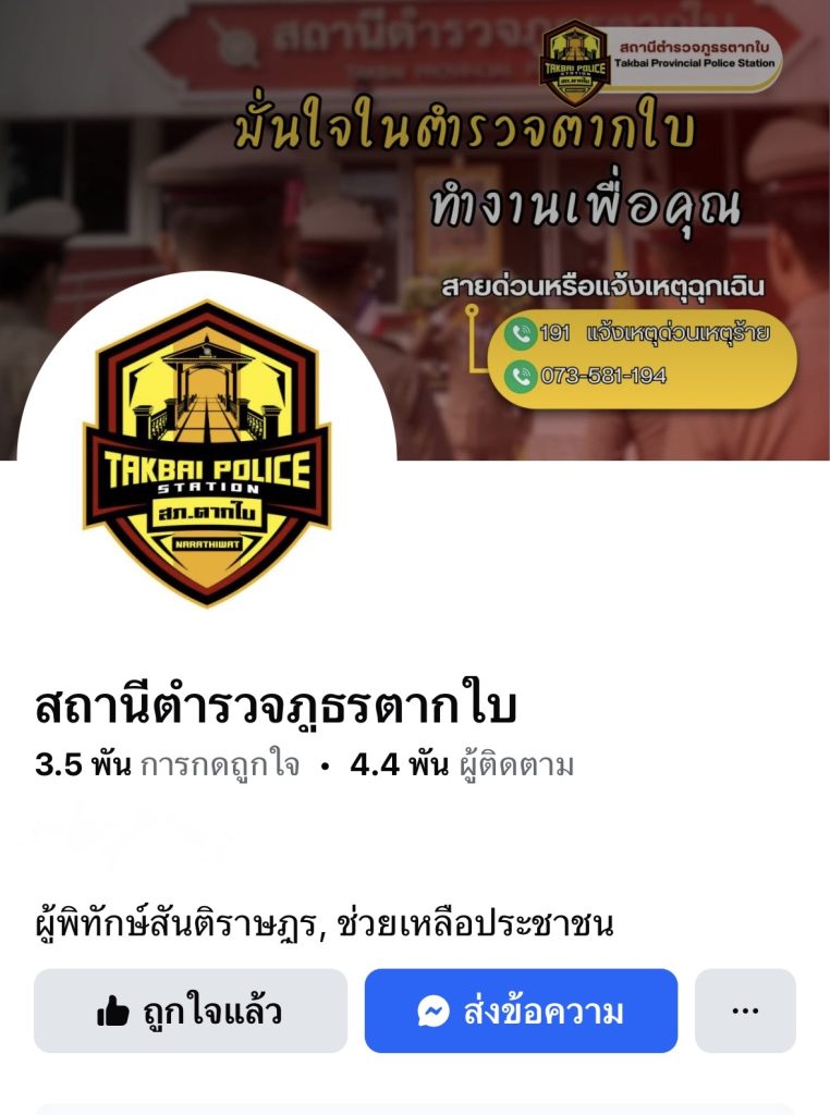 Facebook และ Tiktok สภ.ตากใบ สามารถติดต่อได้ทางช่องทาง Chat (แชท) ช่องทางดังกล่าวได้