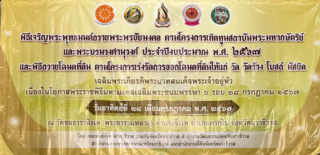 รอง ผบก.ฯ และ ผกก.สภ.ตากใบ พร้อมด้วย ข้าราชการในสังกัด ร่วมพิธีเจริญพระพุทธมนต์ถวายพระพรชัยมงคลฯ 28 กรกฎาคม 2024 โดย Administrator-Faisan / ข่าวภารกิจผู้บังคับบัญชา วันที่ 28 กรกฎาคม พ.ศ.2567เวลา 13.00น. พ.ต.อ.สิทธิพงษ์ หัสรังษีรอง ผบก.ภ.จว.นราธิวาส พ.ต.อ.ศุภชัช ณ พัทลุงผกก.สภ.ตากใบพร้อมด้วย ข้าราชการในสังกัด ร่วมพิธีเจริญพระพุทธมนต์ถวายพระพรชัยมงคล และพิธีถวายโฉนดที่ดินเฉลิมพระเกียรติ พระบาทสมเด็จพระเจ้าอยู่หัว เนื่องในโอกาสพระราชพิธีมหามงคลเฉลิมพระชนมพรรษา 6 รอบ 28 กรกฎาคม 2567 โดยมี นายฉัตรชัย อุสาหะ รอง ผวจ.ฯ/เป็นประธานในพิธีณ วัดชลธาราสิงเห(พระอารามหลวง) ต.เจ๊ะเห อ.ตากใบ จว.นราธิวาส